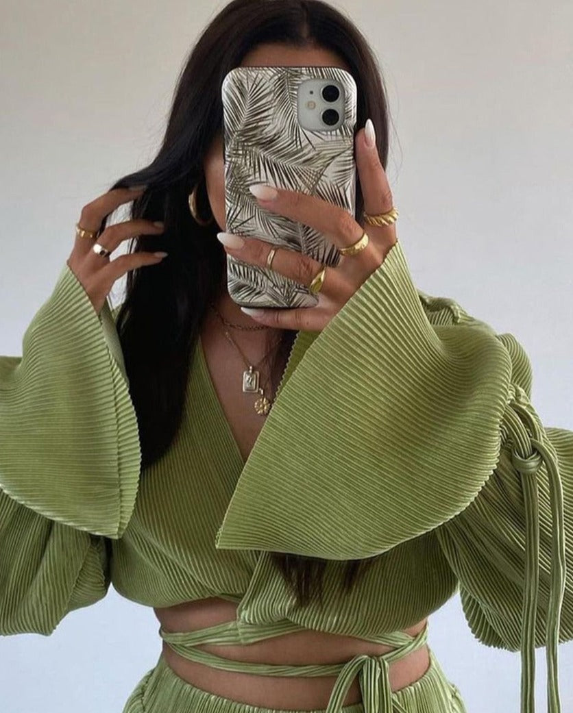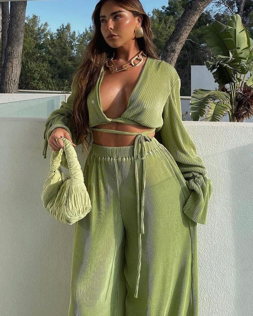 High waist pleated pants feature elastic waist and wide legs.